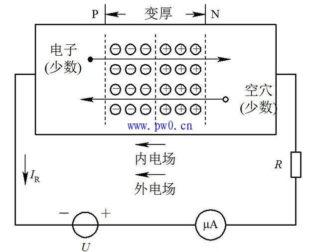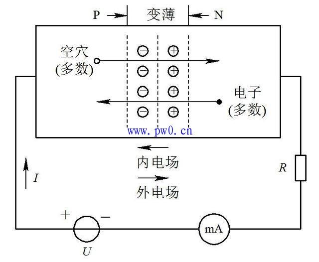 外加电场与内电场的方向一致,因而加强了内电场,使PN结加宽,阻碍电子扩散,形成反向电流微弱。