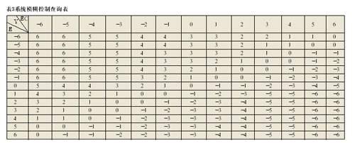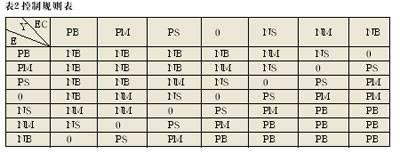 其中,xi为离散论域中的元素,u(xi)为每个论域元素上的隶属度。计算所得的精确控制量再乘以比例因子,就得到实际的控制量。为了减小计算量,不必每次输出都进行模糊推理和模糊判决,我们可采用建立模糊查询表的办法,按照先前的步骤对E和EC离散论域中的元素分别进行模糊化,然后通过模糊推理和模糊判决得到对应的属于控制量离散论域的精确控制量Y,最后将所得结果制成模糊控制表,本系统模糊控制表如表3所示。
