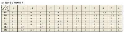 其中,a表示三角形左端对应的X轴的值,b为三角形顶端对应的X轴的值,c为三角形右端对应的X轴的值。表1为输出变量Y的语言变量赋值表,偏差和偏差变化率的语言变量赋值表格式和计算方法与此类似。