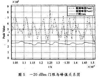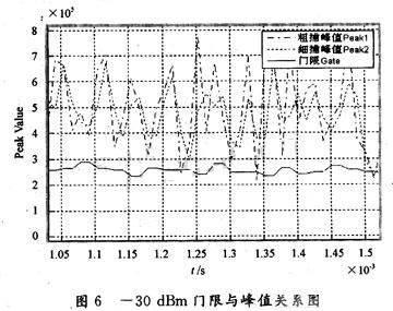 图6是输入信号功率为-30 dBm,信噪比为-16 dB时的门限与峰值关系图。[page]