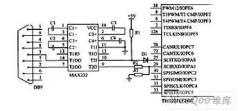 PC机串行口使用的是标准RS-232-C电平,低电平“0”在+5V~+15V之间,高电平“1”在-5V~-15V之间。而TMS320LF2407的电源为3.3V,低电平“0”在+0.4V~+0.8V之间,高电平“1”在+2.4V~+2.8V之间。为了使二者电平匹配,在DSP与PC机之间必须进行电平逻辑转换,本系统中采用的是MAXIM公司的MAX232集成芯片。具体硬件接口电路如图所示。