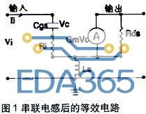0其中△=|S11S22-S12S21|。当K>1且△<0时,放大器处于绝对稳定状态;K<1,电路则潜在不稳定。由于AFT54143在工作频段内不是绝对稳定的,为了提高放大器的稳定性,在输出端并联一个100Ω的电阻。为确保ATF54143在尽可能宽的频带内保持稳定,这里采取源极引入串联感性反馈的方法,电感采用一段很细的微带线来代替,晶体管接入串联反馈电感后的等效电路如图1所示。