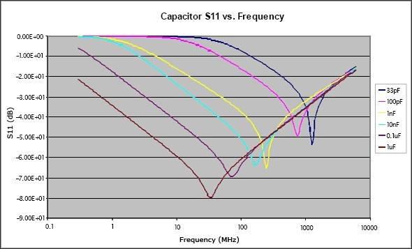 之后,电容的阻抗将呈现出电感性。由此可见,电容器只是在频率接近或低于其SRF时才具有去耦作用,在这些频点电容表现为低阻。图3给出了不同容值下的典型S11参数,从这些曲线可以清楚地看出它们的SRF,还可以看出电容越大,在较低频率处所提供的去耦性能越好(所呈现的阻抗越低)。