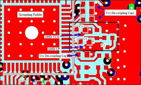 滤除其它电路的噪声、抑制本地产生的噪声,从而消除级与级之间通过电源线的交叉干扰,这是VCC去耦带来的好处。如果去耦电容使用了同一接地过孔,由于过孔与地之间的电感效应,这些连接点的过孔将会承载来自两个电源的全部RF干扰,不仅丧失了去耦电容的功能,而且还为系统中的级间噪声耦合提供了另外一条通路。在本文第三部分的讨论中将会看到,PLL的实现在系统设计中总是面临巨大挑战,要想获得满意的杂散特性必须有良好的地线布局。