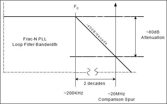 上述讨论提出了另外一个问题,即如何有效地将PLL杂散成分限制在一定的范围内,使其不对发射频谱产生影响。一旦发现了杂散成分,首先想到的方案就是将PLL环路滤波器的带宽变窄,以便衰减杂散信号的幅度。这种方法在极少数的情况下是有效的,但它存在一些潜在问题。图8给出了一种假设情况,假设设计中采用了一个具有20MHz相对频率的N分频合成器,如果环路滤波器是二阶的,截止频率为200kHz,滚降速率通常为40dB/十倍频程,在20MHz频点可以获得80dB的衰减。如果参考杂散成分为-40dBc(假设可以导致有害的调制分量的电平),产生杂散的机制可能超出环路滤波器的作用范围(如果它是在滤波器之前产生的,其幅度可能非常大)。压缩环路滤波器的带宽将不会改善杂散特性,反而提高了PLL锁相时间,对系统产生明显的负面影响。