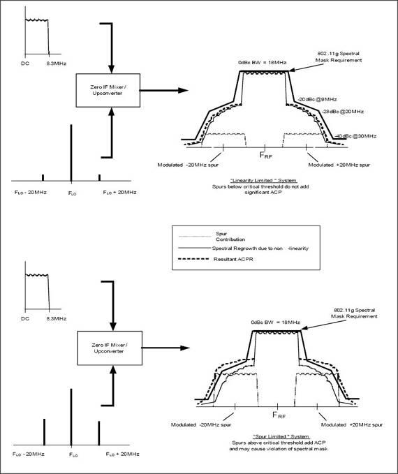 满足802.11a/b/g系统发送频谱模板的要求是设计过程中的一个难点,必须对线性指标和功耗进行平衡,并留出一定裕量,确保在维持足够的发射功率的前提下符合IEEE和FCC规范。IEEE802.11g系统在天线端所要求的典型输出功率为+15dBm,频率偏差20MHz时为-28dBr。频带内相邻信道的功率抑制比(ACPR)是器件线性特性的函数,这在一定前提下、对于特定的应用是正确的。在发送通道优化ACPR特性的大量工作是凭借经验对TxIC和PA的偏置进行调节,并对PA的输入级、输出级和中间级的匹配网络进行调谐实现的。