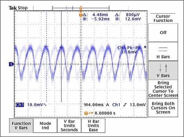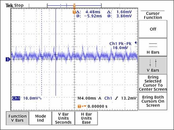 经验证明,抑制PLL杂散的有效途径是合理的接地、电源布局和去耦技术,本文讨论的布线原则是减小PLL杂散分量的良好设计开端。考虑到电荷泵中存在较大的电流变化,采用星形拓扑非常必要。如果没有足够的隔离,电流脉冲产生的噪声会耦合到VCO电源,对VCO频率进行调制,通常称为“VCO牵引”。通过电源线间的物理间隔和每个VCC引脚的去耦电容、合理放置接地过孔、引入一个串联的铁氧体元件(作为最后一个手段)等措施可以提高隔离度。上述措施并不需要全部用在每个设计中,适当采用每种方式都会有效降低杂散幅度。图9提供了一个由于不合理的VCO电源去耦方案所产生的结果,电源纹波表明正是电荷泵的开关效应导致电源线上的强干扰。值得庆幸的是,这种强干扰可以通过增加旁路电容得到有效抑制。图10显示的是在电路改变后,在同一点的测量结果。