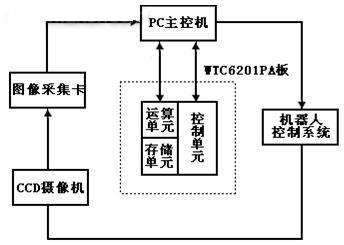 我们选用了WTC6201PA板上的TMS320C6201芯片、FPGA、SBSRAM、SDRAM、双口RAM、PCI总线、JTAG接口等硬件资源作为视觉图像处理单元,和PC主控机、图像采集卡、CCD摄像机和机器人控制系统组成系统,原理框图如图3所示。