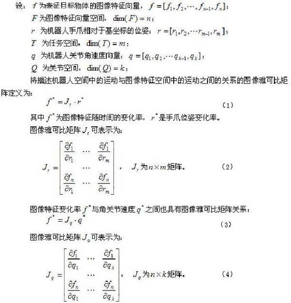 对于图像反馈机器人视觉伺服系统控制机构,图像雅可比矩阵是很关键的,它描述了机器人空间中的运动与图像特征空间中的运动之间的关系: