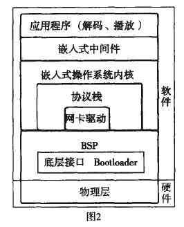 sophia板使用的嵌入式Linux内核是由基于linux-2.4.20内核的MontaVista linux编译而成,文件系统是针对Flash 无缓冲机制的jffs2 文件系统。同时,sophia 板的开发商还提供了BSP、中间件等大量的软、硬件资源,其中通信接口中的网络控制模块、解码模块和播放器模块是系统开发的关键。整个系统的模块划分如图2 所示:Bootloader 在硬件物理层之上进行最底层的引导,它属于板级支持包BSP 的一部分。BSP负责直接和底层的硬件设备建立联系,同时,它也可以包含某些驱动。不过,在sophia 的软件系统模块中,网卡的驱动是作为嵌入式系统内核的模块之一动态加载的。嵌入式中间件位于操作系统和应用程序的中间环节,提供了到程序模块、组件库的联接,系统的解码模块和播放器模块都是在它之上开发的。