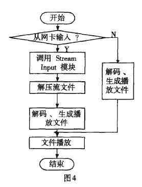 由网络控制模块获取的数据在系统中是以流数据的形式存在的,因此,首先要对流式文件进行解压。同时,为了提高传输效率从而提高视频图像质量,网络上传输的原始视频图像都进行了压缩编码,所以,还需要根据编码格式进行相应解码。本系统不但支持常见的MP1、MP2、MP3 和WAV 音频文件格式,还可以对先进的MPEG- 4视频图像压缩编码文件解压缩。