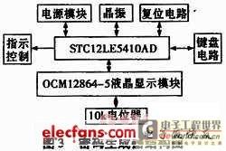 以STC12系列单片机STC12LE5410AD(3 V单片机)为核心,结构框图如图3所示。其功能模块主要由电源电路模块、键盘电路、液晶显示模块和指示控制模块四部分组成的。