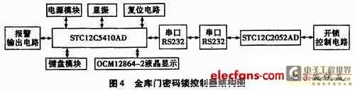 以STC12系列的STC12C5410AD(5V单片机)为核心,结构框图如图4所示,主要包括电源电路模块、液晶显示驱动模块、键盘电路模块、报警输出模块以及和STC12C2052AD通信的串口通信模块、开锁控制电路。