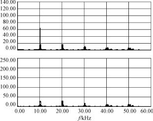 为了研究载波调制的谐波消除效果,采用电力电子专用仿真软件PSIM对图1所示的三电平变换器进行了仿真研究。仿真参数设置载波的频率fc=10kHz,调制正弦波的频率fm=50Hz,幅度调制比为ma=0.9。相电压、线电压的仿真波形如图5(a)所示。从仿真结果不难看出三电平的谐波主要集中在载波频率的倍数的位置,如图5(b)所示,而低次谐波很小。