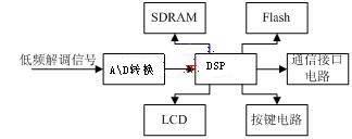 ① 低频解调信号被A/D转换器转换成适用于DSP处理的数字信号。本设计选用的是TI公司的多采样频率、低功耗、单电源供电的A/D转换芯片AD9221,其最大采样频率高达1.5MHz,信噪比70dB,采样精度高,足以满足系统设计的需要。