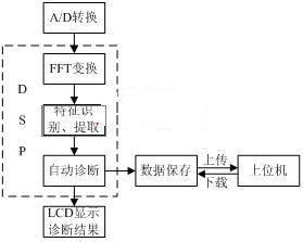 (2) 软件部分:主要是基于DSP对共振解调后的振动信号进行故障特征的识别与诊断。DSP对AD传送来的数字信号进行时频转换,得到振动信号的频谱图,系统能自动分析频谱,得出故障位置、故障类型、严重程度等结论并通过LCD显示出来。