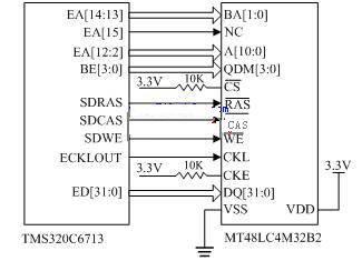 ③ TMS320C6713的内部最多只有256K的L2 SRAM,不能满足系统大容量数据存储的需要,需要扩展外部存储的空间,系统采用Micron公司的32位SDRAM芯片MT48LC4M32B2,扩展了128M的动态存储空间。