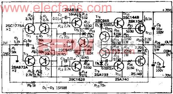 电压高(120VP-P)的功率MOSFET放大器电路及工作原