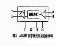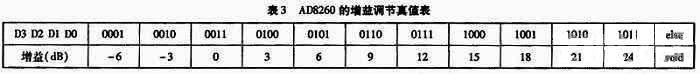 信号调理电路主要采用具有可变增益的数字程控放大器ad8260。ad8260是ad公司生产的一款大电流驱动器及低噪声数字可编程可变增益放大器。该器件增益调节范围为-6 db~+24 db,可调增益的-3 db带宽为230mhz,可采取单电源或双电源供电。主要用于数字控制自动增益系统、收发信号处理等领域。本设计主要使用其数字控制自动增益功能。ad8260内部的数字程控增益功能框图如图3所示。经阻抗匹配后的信号可直接输入ad8260的17、18脚,经ad8260内部前端放大器6 db的固定增益放大,-30 db程控衰减以及末级放大器18 db固定增益放大后,由7和8脚输出。第11、12、13、14脚为四位数字控制信号(d0、d1、d2、d3),与stm32的i/o口直接连接,实现增益控制。表3给出了ad8260增益调节真值表。