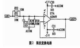 对于低速数据采集,由于信号反射对信号的传输过程影响微乎其微,所以低速数据采集系统良好的高阻抗性能,对提高系统的测量精确度有很大的意义。本设计中采用电压跟随器实现阻抗变换,数据采集阻抗变换电路的设计方案如图2所示,其输入阻抗为10mω。