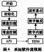 系统软件设计采用模块化设计方法,整个程序主要由初始化程序、人机交互菜单程序、键盘扫描程序、触发程序、显示程序和数据采集及频率控制程序组成。系统软件的流程图如图4所示。