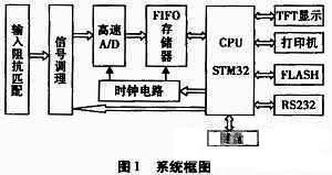 系统硬件总体框图如图1所示,主要由stm32控制单元,信号输入阻抗匹配单元,信号调理单元,a/d采样与fifo存储单元,时钟单元,tft显示单元等组成。输入信号经阻抗匹配后,送入信号调理单元,将信号的幅度放大或衰减到适合a/d采样的范围内,a/d采样单元对幅度为2vpp的信号进行a/d采样,并将采样结果存入fifo单元中。cpu从fifo中读存数据并进行内插运算,然后根据用户通过键盘输入的指令将信号波形显示在tft液晶屏上。另外,cpu还可以将数据通过rs232接口上传给上位机,或进行打印等处理。