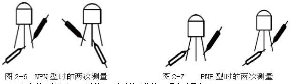 根据三极管的内部结构,可以将三极管的内部看作两个二极管组合而成,如图2-4所示。对于PNP管的基极是两个二极管负极的共同点,NPN管的基极是两个二极管正极的共同点。利用这一点可以用数字万用表的二极管挡。