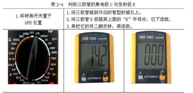2.判别三极管的集电极C、发射极E及直流放大倍数(测量方法见表2-4)。
