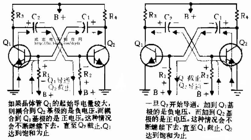 电路上电时,Vcc加到电路,由于两只三极管都是正向偏置的故他们处于导通状态,此外,还为藕合电容器Cl和C2充电到近于Vcc电压。充电的路径是由接地点经过晶体管基极,又通过电容器而至Vcc电源。还有些充电电流是经过R1和R2的,从而导致正电压加在基极上,使晶体管导电量更大,因而使两级的集电极电压下降。