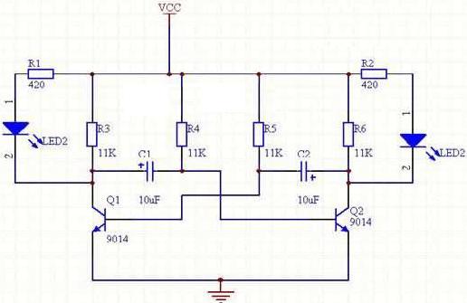 在明白了多谐振荡器的基本原理后,我们就可以利用这个电路控制两个发光二极管交替的闪烁了。