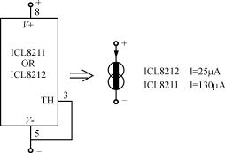 式中β表示V1的放大倍数,VBE表示发射极—基极电压。这个电流值和实际值有偏差是由于β值随V1集电极电压变化的原因。在2V~30V的工作电压范围内可编程电流范围为300μA~50mA。这个电流可用作常用的串联稳压源的工作电流。在这一些高稳定应用场合,可用这个恒流源作稳压管的供电电流。同时由于ICL8212中没有补偿,C1用作确保电路稳定工作,并可在供电电压发生变化或瞬态期间保证输出电流恒定。