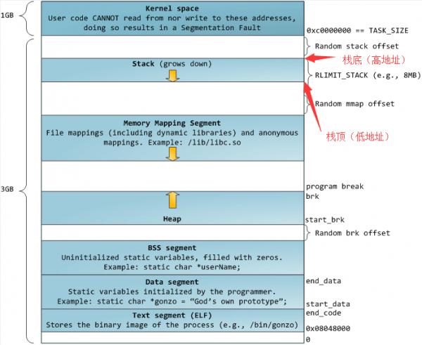 首先我们需要了解一下linux下一个进程的内存地址空间是如何布局的,在linux中,0~3G的虚拟地址为进程所有,3G~4G由内核所使用,每一个进程都有自己独立的0~3G内存地址空间。当进程进行函数调用时,我们都知道传入被调用函数的参数是通过栈进行操作的,这里我们只需要简单了解一下linux的内存地址空间中的栈是自顶向下生长的,就是栈底出于高地址处,栈顶出于低地址处。
