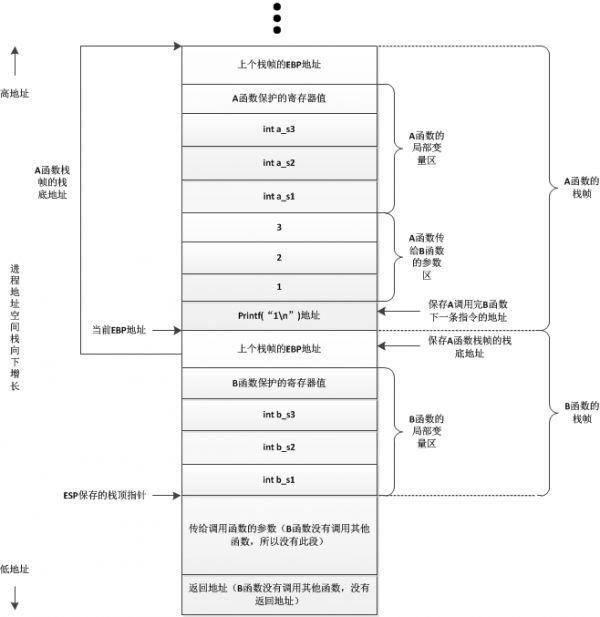 从图例中可以看出,当A函数没有调用B函数时,A函数的栈帧只保存着局部变量,而EBP(栈底指针)指向的是A函数的函数栈帧头,而当A函数调用B函数时,A函数会将B函数所需要的参数从右往左压入栈(在例子中先压入3,之后是2,最后是1),之后会将A调用完B之后所需要运行的第一条指令压入栈,此时建立一个B的栈帧,具体流程: