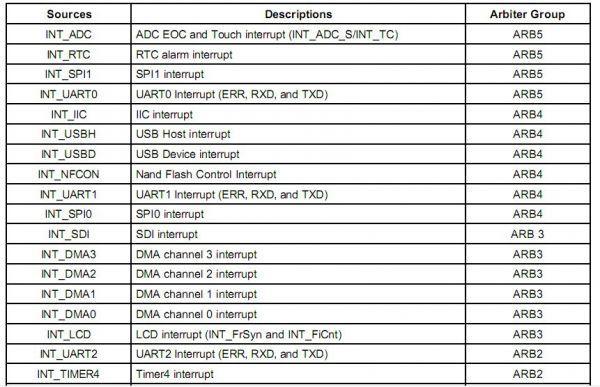 我们来简单描述一下S3C2440的中断内容,它总共有60个中断源,分为中断源和子中断源;下图为中断源种类: