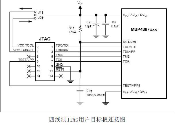 3、如果仿真过程中目标板不加供电电源,将由FET 提供电源,这是应将JTAG的2脚与目标板上MSP430 芯片的VCC 相连,电源将从JTAG 的第2 脚提供给MSP430。如果仿真的过程中目标板是由外部提供电源,请将JTAG 插座的4 脚与目标板MSP430 芯片的VCC相连。