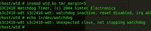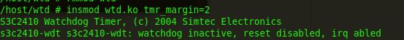 wdt.ko为驱动文件名,不加任何参数如果不喂狗,则计数器到0时执行中断函数(设置LED的状态,然后喂狗,重新设置WTCNT的值)