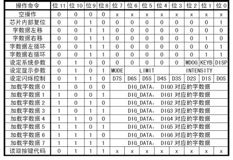每次往串行接口输送数据前,需要了解操作命令的含义,该输送什么命令,这是本小节讨论的。下表列出了CH451 的各个操作命令所对应的12 位串行数据。其中,标注为x 的位表示该位可以是任意值;标有名称的位表示该位在CH451芯片内部具有相应的寄存器,其数据根据操作命令的不同而变化。