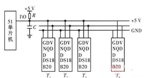 针对串联电池组,传统的测温方法多采用模拟温度传感器进行测量,在数据的采集和传输过程中易受外界环境的干扰,从而使测得的结果误差较大,且当测量点较多时,连线较复杂。文中采用单片机和单总线数字式温度传感器DS18B20 来解决上述问题[5].其原理如图5 所示。