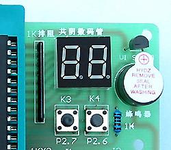 +5V通过1K的排阻直接给数码管的8个段位供电,P2.6和P2.7端口分别控制数码管的十位和个位的供电,当相应的端口变成低电平时,相应的位可以吸入电流。单片机的P0口输出的数据相当于将数码管不要显示的数字段对地短路,这样数码管就会显示需要的数字。
