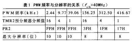 PWM位数N与频率fPWM满足下式:。式中,fclk表示单片机的时钟频率。PR2为单片机PWM周期寄存器,fPWM越高存入PR2的值越小。设存入PR2的值为M,则最大分辨率为分频值f/M。由此可见,频率不一定越高越好,过高的频率会降低PWM分辨率。PWM输出的频率与分辨率之间的关系如表1所示。