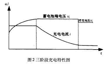三阶段充电,开始时采用恒流充电,中间为恒压充电,最后采用浮充充电。该充电法减少了充电出气量,充电比较彻底,延长了蓄电池使用寿命。三阶段充电法充电电流和充电电压变化曲线如图2所示。