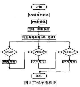 根据三阶段充电的原理,画出系统的主程序流程图,如图3所示。(其中Um为蓄电池的最大电压上限,Ubat为恒压充电门限,Ibat为恒流充电门限,其值一般取蓄电池容量的1/10。)