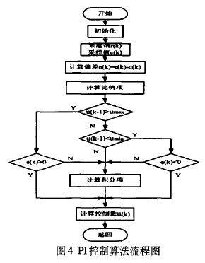 遇限削弱积分PI算法,实际上是一旦控制量进入饱和区范围,则停止增大积分项的运算而只执行削弱积分项的运算[5]。PI程序流程图如图4所示。