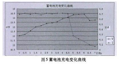 图5为样机给铅酸蓄电池充电变化曲线图,横轴为充电时间,左边Y轴为蓄电池电压,右边Y轴为充电电流。