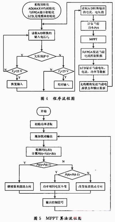 扰动观察法是一种较为简单实用且容易实现的方法,其思想是通过周期性的给电源的输出电压加扰动△V,测得电源的输出电流和电压,比较该采样时刻的输出功率P(t)与前一采样时刻输出功率P(t-1)的大小;如果P(t)>P(t-1),则在下一周期以同样方向加扰动,否则改变扰动的方向,这样逐步逼近最大功率点。但跟踪步长的设定无法兼顾跟踪精度和响应速度,在最大功率点附近振荡运行,会导致一定功率损失。