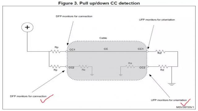 从上面管脚图可以看到两个CC配置脚,分别是CC1和CC2。不过对于一个方向的插头而言只有一个CC脚与之相连。对于两个CC脚,DFP端口必须与之接个上拉电阻Rp;UFP端口必须与之接个下拉电阻Rd。通过检测与CC脚相连的Rp/Rd电阻的电平来确认插入方向和设备角色。