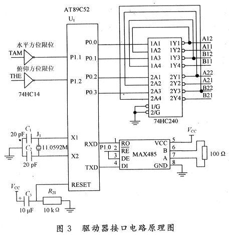 跟踪系统中微处理器选用89系列性价比高和功耗低的89C52。74HC14芯片是6非门施密特触发器,与P1.1和P1.2口相连,控制方位限位信号。74HC240芯片,八反相三态缓冲器/线驱动器,用于数据缓冲及总线驱动。系统使用两片74HC240芯片,通过P0口引脚控制,两片74HC240的16个输出引脚作为步进电机驱动电路的输入控制信号,分别控制步进电机俯仰方向和水平方位的正反转。系统与上位机的通信选用MAX485接口芯片,由P1.0口控制其收发状态。驱动器接口电路如图3所示。