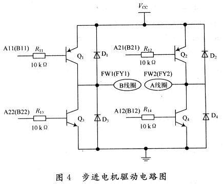 步进电动机是一种用电脉冲信号进行控制,并将电脉冲信号转换成相应角位移的执行器。在跟踪系统中,以74HC240的16个输出信号作为步进电机驱动器的输入控制信号,用以控制步进电机俯仰方向和水平方位的正反转。图4所示的是步进电机一路驱动电路图,系统共有四路驱动电路,分别驱动步进电机俯仰方向和水平方位的正反转。
