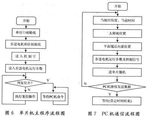 任意时刻太阳的位置可以用太阳视位置精确表示。太阳视位置用太阳高度角和太阳方位角两个角度作为坐标表示。太阳高度角指从太阳中心直射到当地的光线与当地水平面的夹角。太阳方位角即太阳所在的方位,指太阳光线在地平面上的投影与当地子午线的夹角,可近似地看作是竖立在地面上的直线在阳光下的阴影与正南方的夹角。系统采用水平方位步进电机和俯仰方向步进电机来追踪太阳的方位角和高度角,从而可以实时精确追踪太阳的位置。上位机负责任意时刻太阳高度角和方位角的计算,并运用软件计算出当前状况下俯仰与水平方向的步进电动机运行的步数,将数据送给跟踪系统驱动器,单片机接收上位机送来的数据,驱动步进电机的运行。系统具有实现复位、水平方位的调整,俯仰方向的调整,太阳的跟踪及手动校准等功能。