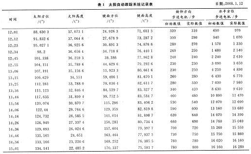表1中列出了2009年1月12日中午至下午三时左右的理论数据,并用系统的手动校准功能,记录下不同时刻的步进电机实际运行步数。